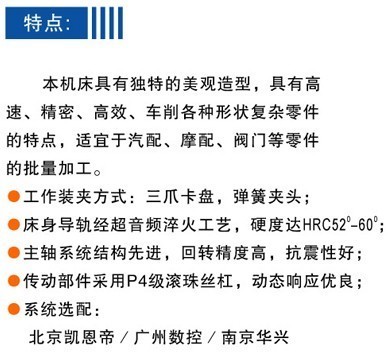 公司生產(chǎn)的CJK系列數(shù)控機床具有精密高、規(guī)格齊、結(jié)構(gòu)合理、通用性強、造型美觀等優(yōu)點。采用高精度軸承,導(dǎo)軌使用超音頻淬火,經(jīng)久耐用。車床采用彈簧快速夾緊,電機直接帶動主軸皮帶輪傳動,并配有縱橫定位裝置控制行程,能完成內(nèi)外圓車削、端面車削、切斷、割槽等,是儀表儀器、電器、汽車零配件、軸承及小五金行業(yè)零件加工的理想設(shè)備。